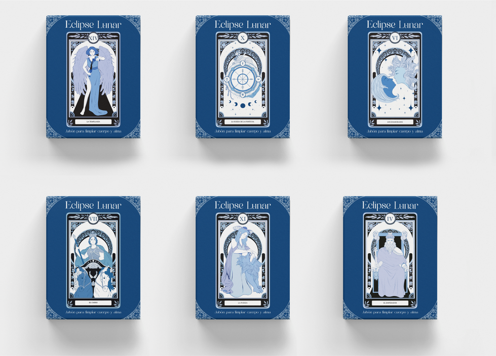 El proyecto consistió en diseñar el packaging para Eclipse Lunar, una marca ficticia de jabones con una identidad elegante y misteriosa, inspirada en los arcanos mayores del tarot. La propuesta incluye seis diseños únicos, cada uno basado en un arcano distinto, donde desarrollé tanto las ilustraciones como la manufactura de cajas, buscando reflejar la simbología y la atmósfera mística de cada carta.